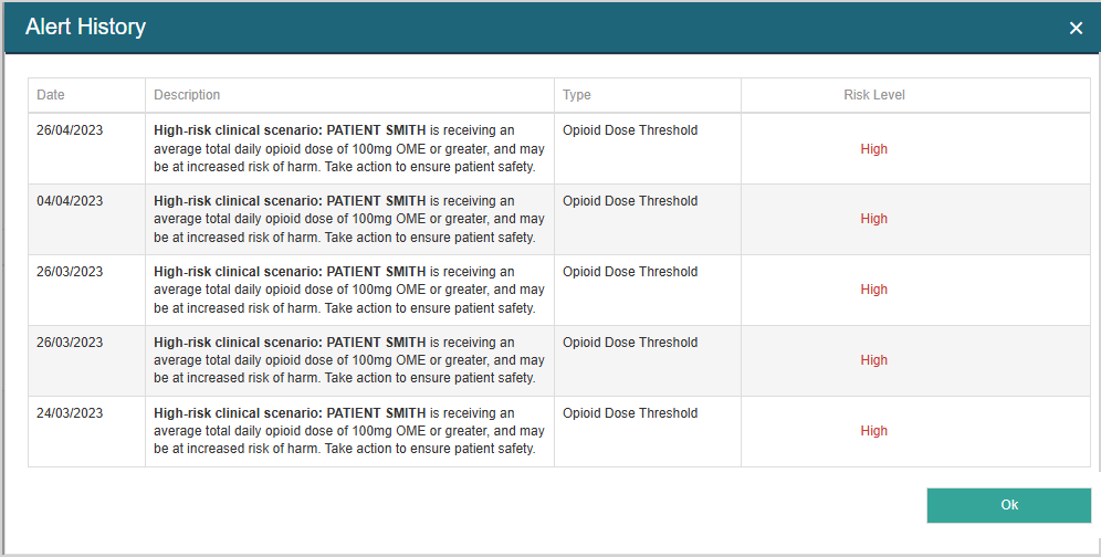 Example patient's Alert History in Management Portal: